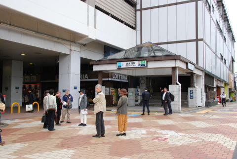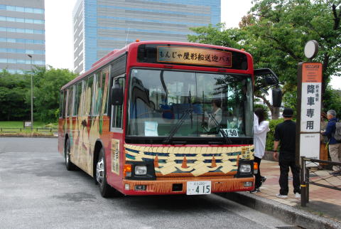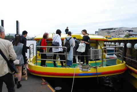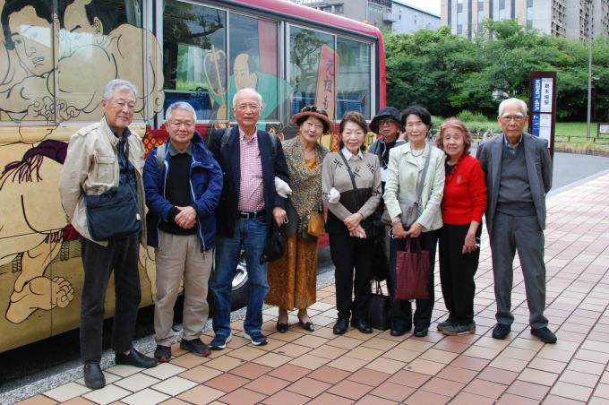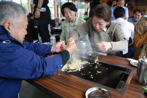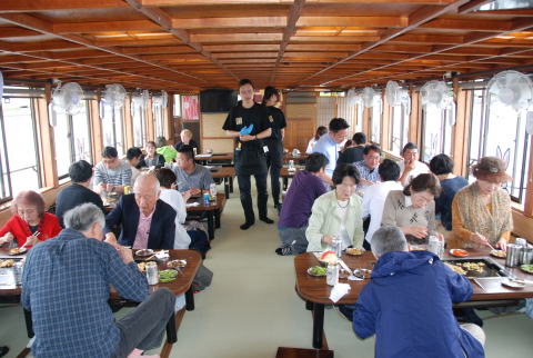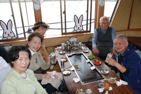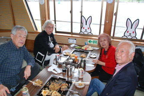 集合場所の新木場駅 乗船桟橋への送迎バス もんじゃ屋形船へ乗船 屋形船の船内 船内案内係の説明でもんじゃ焼きに挑戦。 もんじゃ焼きはまずまずの出来でした。 普段より大変ビールが進みました。 解散前に記念写真を撮影