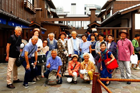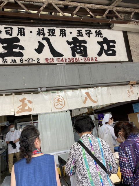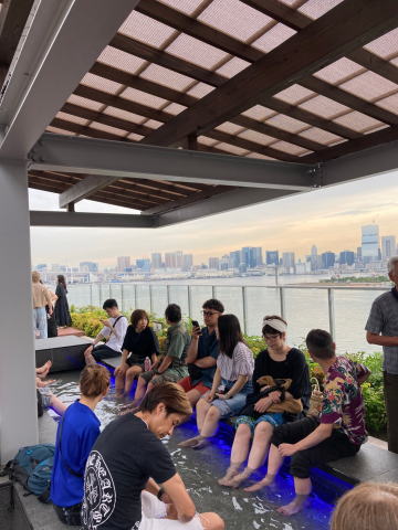 築地場外市場 場外市場で評判の玉子焼き 豊洲のホテル8階にある無料の足湯 千客万来 豊洲の千客万来会場で記念撮影 麻布台ヒルズの中庭 麻布台ヒルズで集合写真の記念撮影